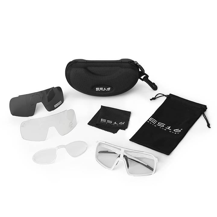 Gli occhiali sono forniti in una custodia rigida, con un panno ES16 e una borsa per occhiali ES16.